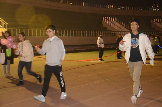 40队参赛选手集合完毕后,主持人宣布趣味夜跑活动正式开始。此次比赛为通关接力跑,共设置三个关卡,全体参赛选手需按照比赛规则以小组为单位进行比赛。第一关:跑至工作人员处原地转3圈并回答3个“快问快答”问题,考验了选手的反应能力;第二关:用圆珠笔夹乒乓球跑至下一关,考验了选手的平衡能力和注意力;第三关:吃柠檬;最后由第四棒同学负责冲刺到终点。每个关卡由工作人员确认过关后盖章,集齐三个印章即为完成任务。比赛用时决定排名,最终颁发了一二三等奖和最佳步数奖。